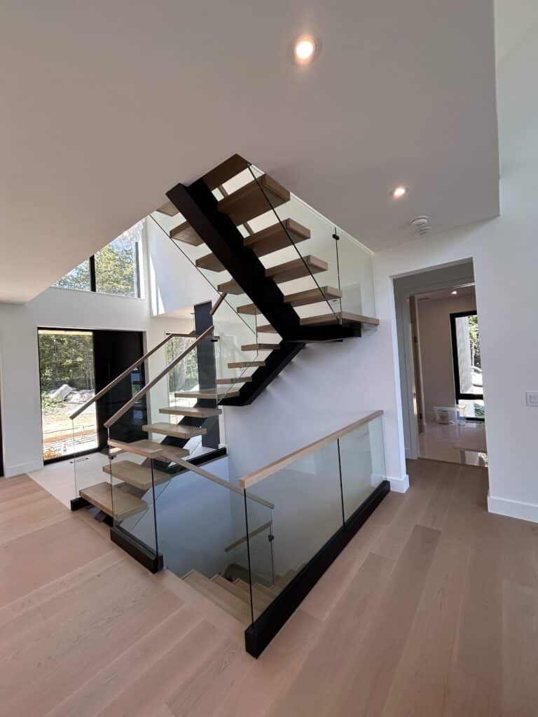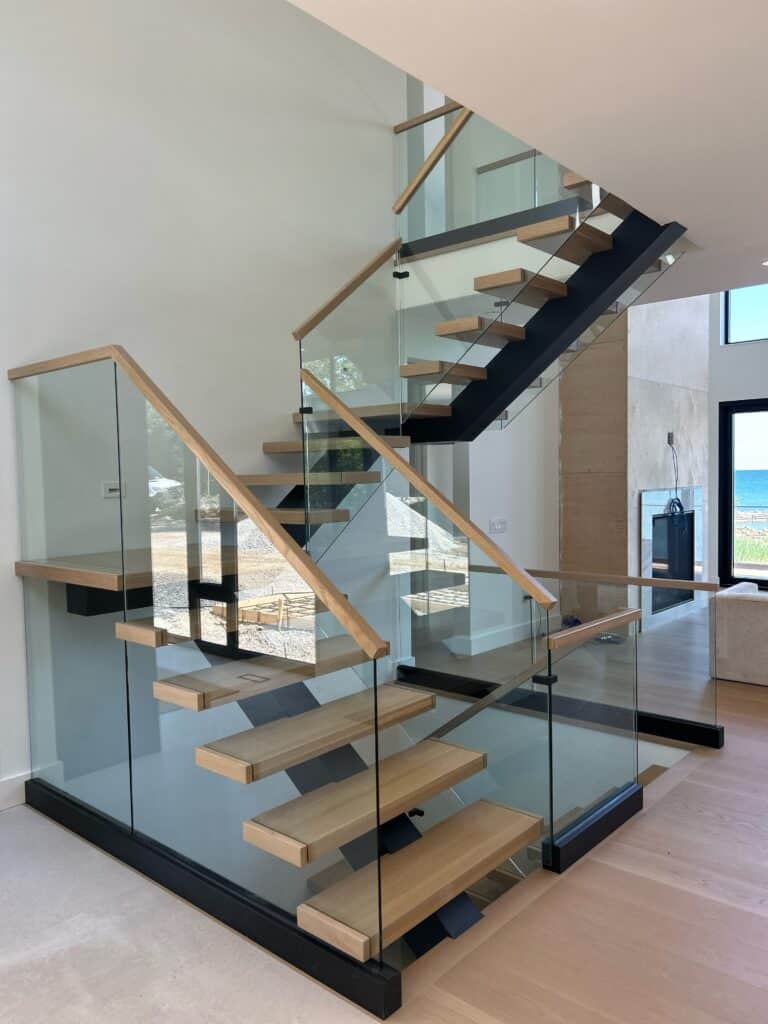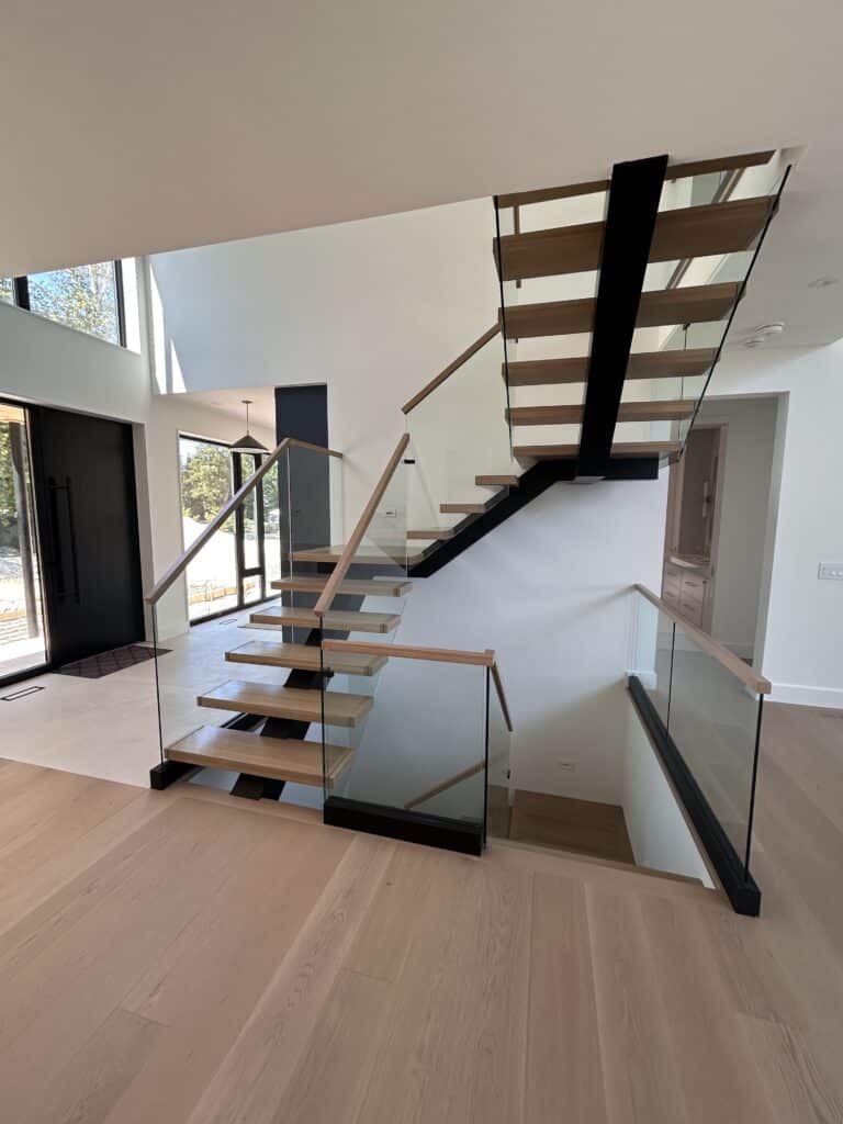 This custom residential project features frameless glass railings throughout the interior staircase and exterior balcony, designed to complement the home’s modern architecture and open-concept layout. Clear tempered safety glass was paired with minimal hardware and wood handrails to maintain unobstructed views, maximize natural light, and create a seamless connection between levels.