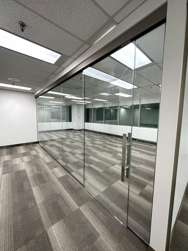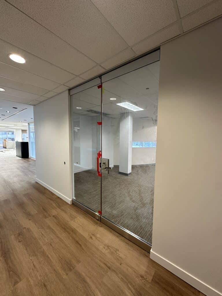 This commercial project at The West Mall featured the supply and installation of a full interior glass office system, including frameless glass partitions and glass door assemblies. The design focused on creating an open, modern workspace while maintaining functionality, privacy, and building code compliance.